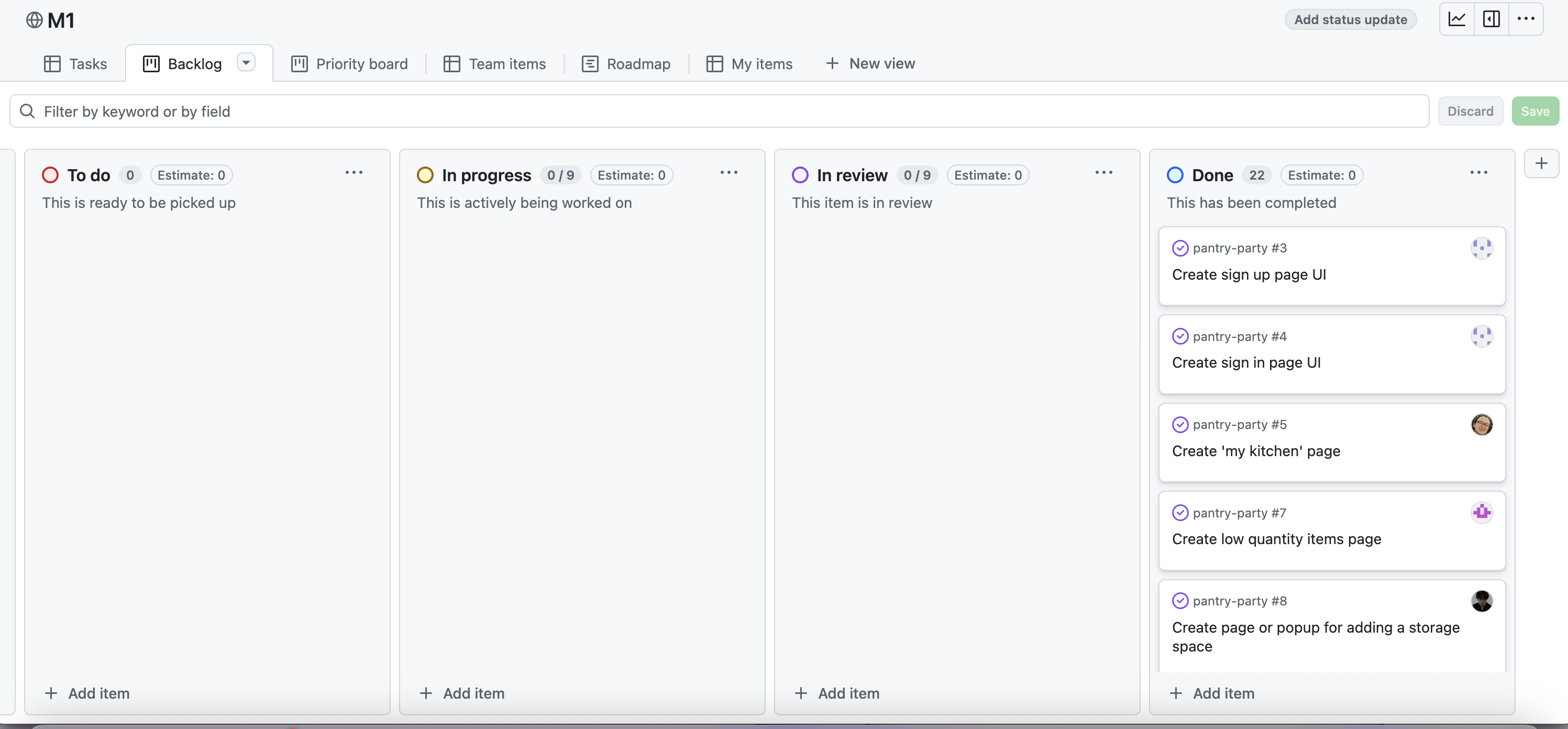 Milestone 1 was managed using Party Pantry GitHub Project Board M1