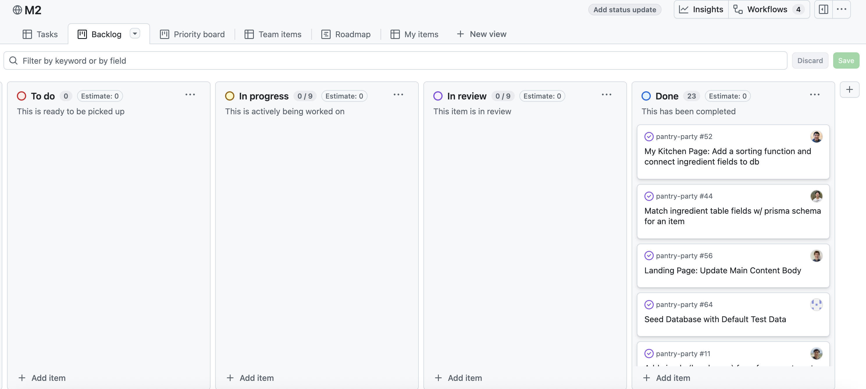 Milestone 2 was managed using Party Pantry GitHub Project Board M2