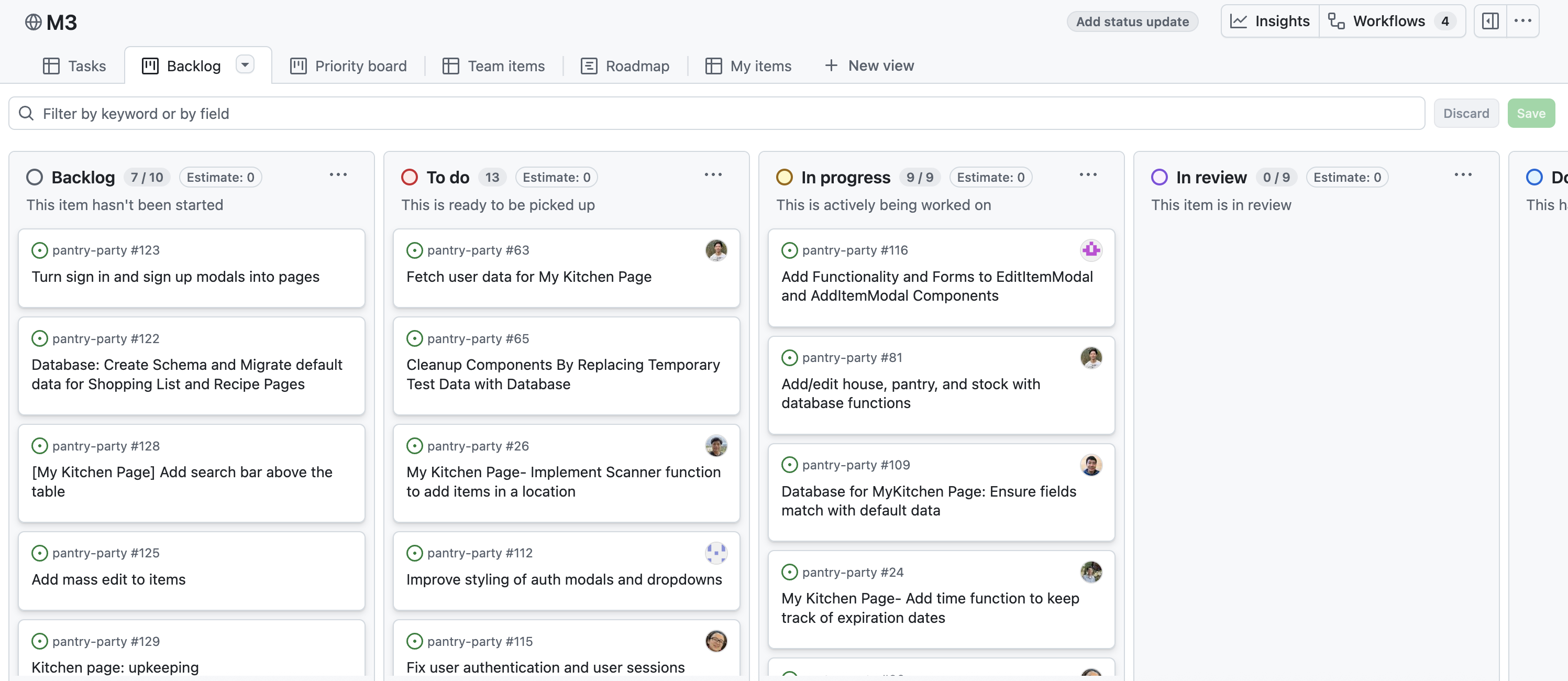 Milestone 3 was managed using Party Pantry GitHub Project Board M3