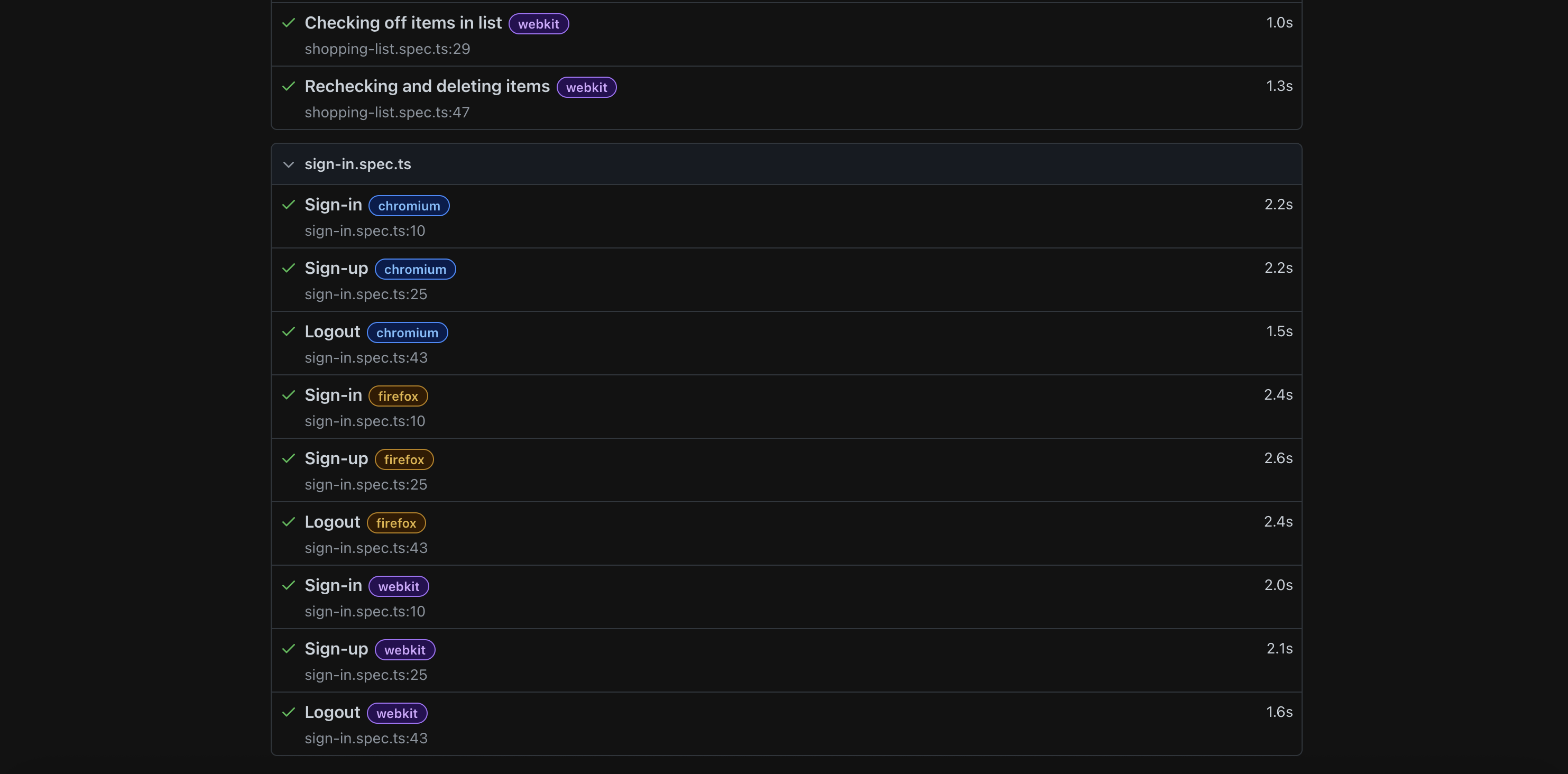 Party Pantry uses GitHub Actions to automatically run ESLint and Playwright tests each time a commit is made to the default branch. You can see the results of all recent “workflows” at https://github.com/party-pantry/pantry-party/actions.